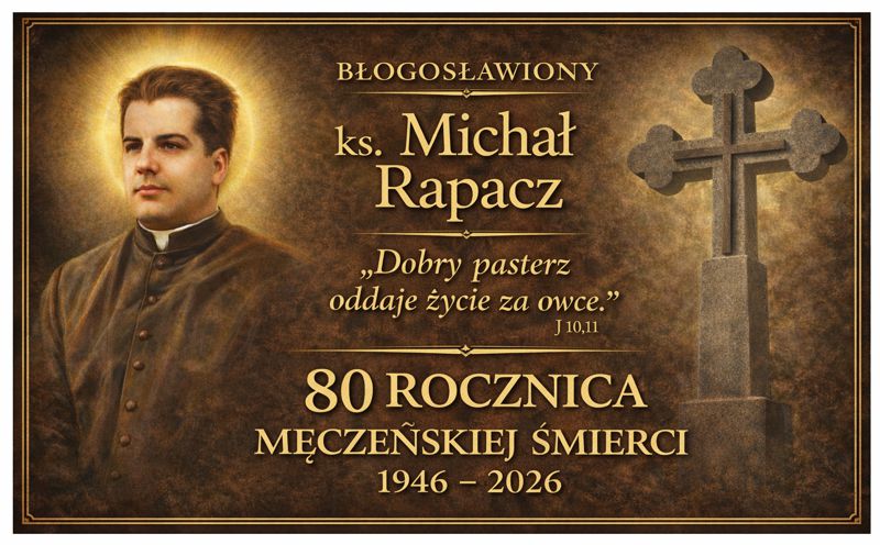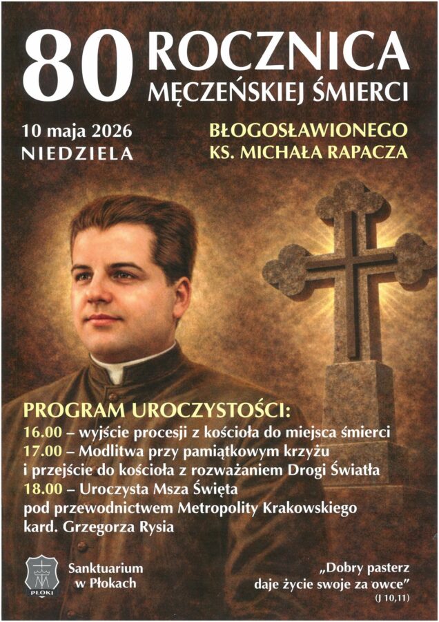 W tym roku obchodzić będziemy 80. rocznicę męczeńskiej śmierci bł. ks. Michała Rapacza. Z tej okazji tradycyjnie z naszej parafii i szkoły wyruszy pielgrzymka autokarowa na uroczystości do sanktuarium w Płokach, Odbędzie się one w niedzielę 10 maja. Zapraszamy do uczestnictwa. Szczegóły na plakacie. Zapisy na wyjazd w zakrystii.