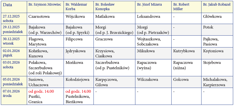 Kolędę będziemy rozpoczynać o godz. 9.00 za wyjątkiem 7 stycznia, kiedy zaczniemy od godz. 14.00. Zwycza­jem naszej parafii, mieszkańcy roli, na której planowana jest danego dnia kolęda, organizują przywiezienie kapłana i ministrantów, a po zakończeniu wizyty duszpasterskiej – odwiezienie. Gospodarz odprowadza kapłana do kolejnego domu i przez gest podania dłoni sąsiadowi wyraża pragnienie życia w pokoju.